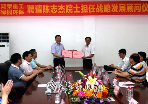 5月15日上午,廣東鴻榮重工股份有限公司和廣東綠園環(huán)??萍加邢薰?/strong>舉行聘請中國工程院陳志杰院士為兩家公司戰(zhàn)略發(fā)展顧問儀式,陳志杰院士在現(xiàn)場為企業(yè)未來的發(fā)展布局把脈開方。梅州日報社總經(jīng)理羅金良,梅縣區(qū)區(qū)委常委黃增國、春天集團董事長李陽春、鴻榮重工總經(jīng)理吳柏強、綠園環(huán)保總經(jīng)理黃立新等參加了聘請儀式。